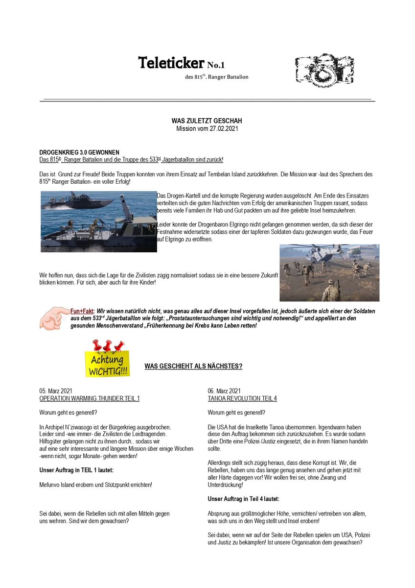 Seitdem hat sich vieles getan. Einige weitere tolle Menschen sind hinzugekommen und so verging einige Zeit bis schließlich ein Bekannter vom Gründervater Blackbird hinzu kam. Dieser ist bis heute stolzes Mitglied bei dem 533rd. Jägerbataillon und ein gern gesehener Gast beim 815th. Ranger Battalion. Die Interessen vermischten bzw trafen sich an manchen Stellen, sodass mittlerweile die ein oder andere Mission mit diesem Clan gestartet wurde. Auch kam sodann KitKat hinzu, eine Bekannte vom Gründervater Painy. Sie ist zügig mit dem Ruf der Quotenfrau (ihre Worte), gute und versaute Seele eingegangen und entwirft bzw überarbeitet seitdem sämtliche Texte, die vom 815th. Ranger Battalion veröffentlicht werden.