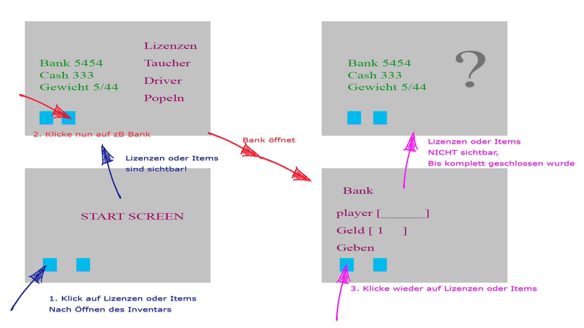 Klicke ich nun auf ein anden Punkt. ZB Bank, und gehe zurück zu Lizenzen, werden diese nicht gelistet, alles andere (Gewicht, Konto, Cash) jedoch schon!.