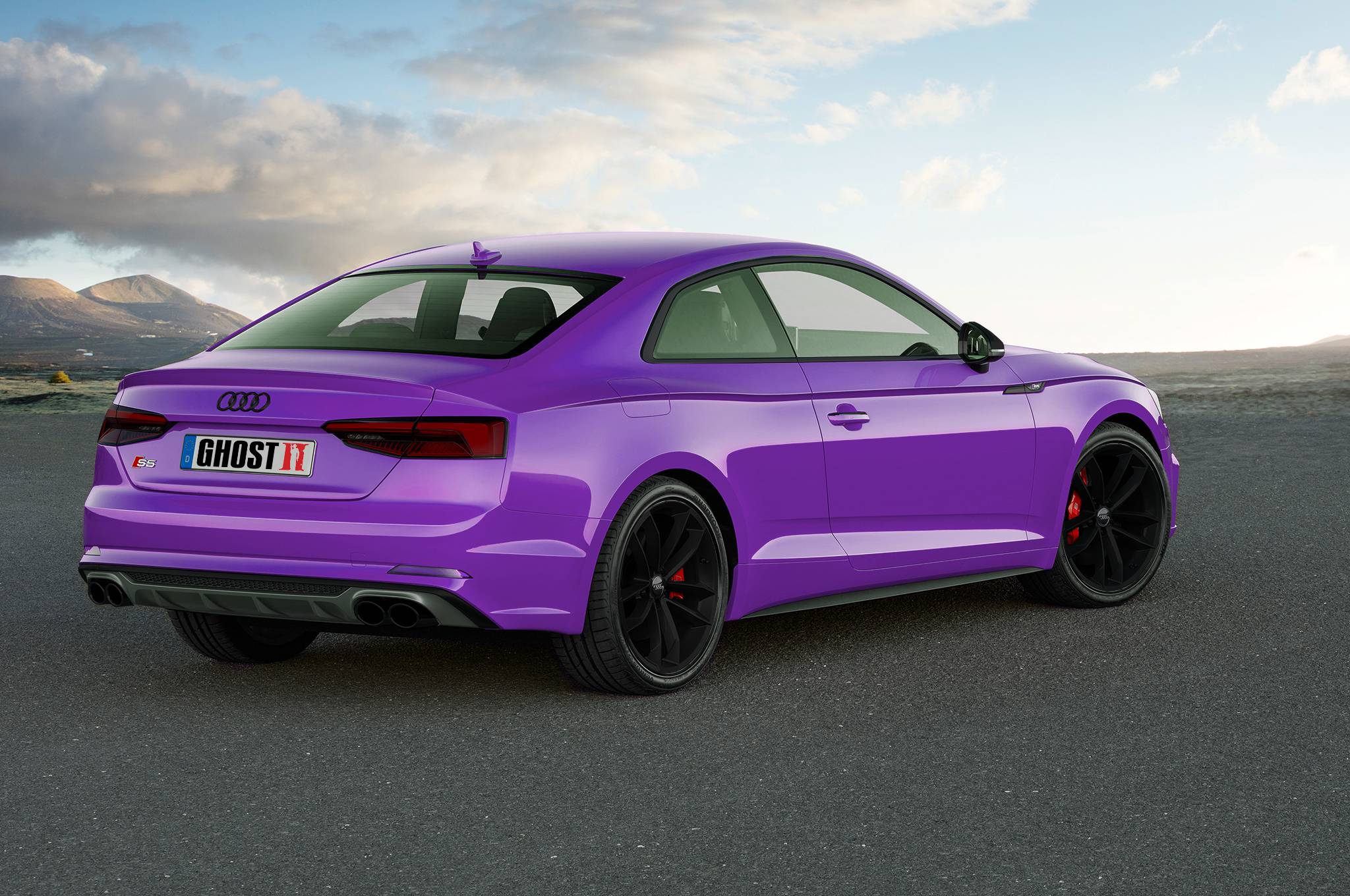 Audi S5 Wallpaper. Standartmäßig in Rot & Silber. Die silbernen Decals habe ich Schwarz Matt gefärbt. Rückleuchten verdunkelt. Das Auto hat eine violette Markierung bekommen. Bremssättel sind standartmäßig in Rot geblieben. Rückreflektoren in violett ist gewollt, da Rot dem Design schaden würde.