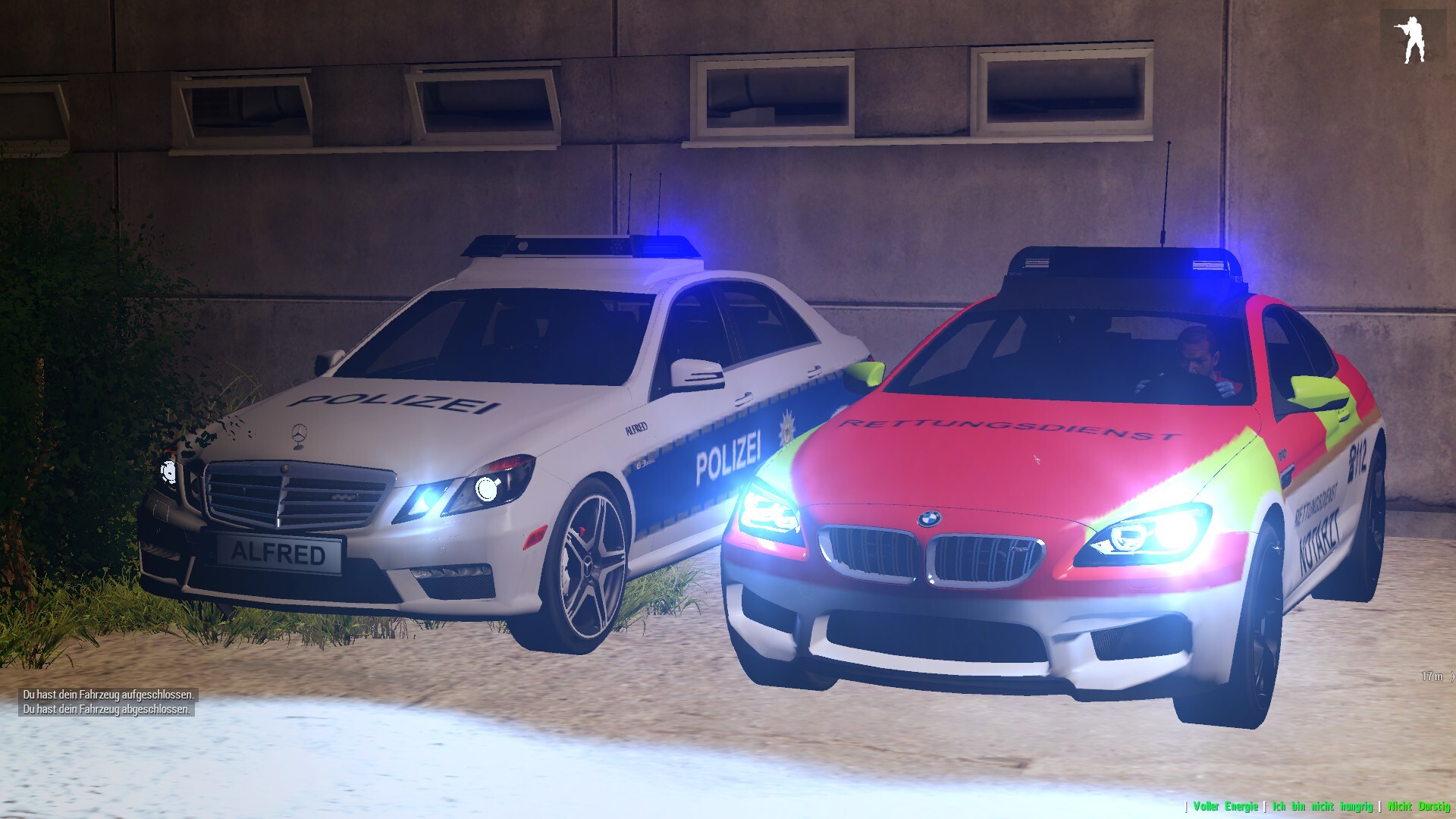 Die beiden Einsatzfahrzeuge des URD's und der Landespolizei Bornholm mit Blaulicht vor dem Kranekenhaus! Nach einer Schießerei wurde der Verletzte per Polizei-Eskorte zum Krankenhaus auf Bornholm gebracht.